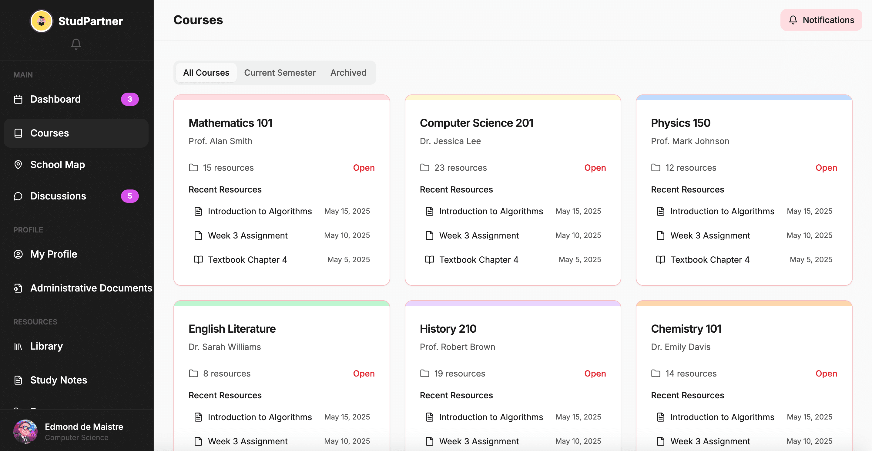 Manage your courses effortlessly with StudPartner, launching soon, with resources for Mathematics 101 and Computer Science 201 at your fingertips.