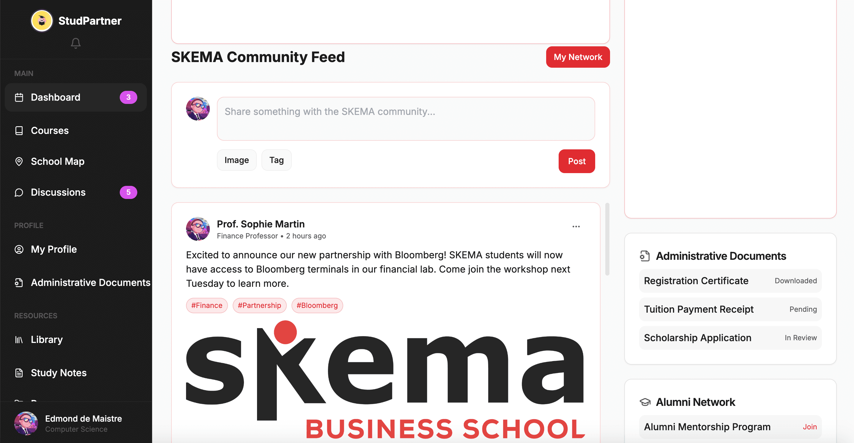 Connect with the School community through StudPartner’s upcoming feed, where exciting updates like the Bloomberg partnership will be shared.