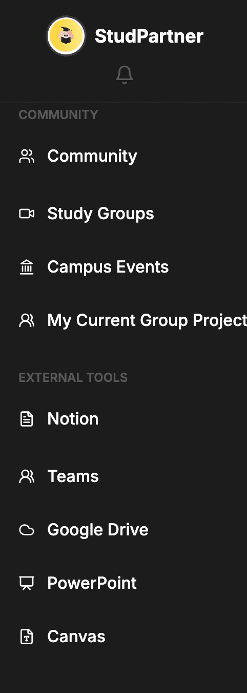 Explore the intuitive menu of StudPartner, your soon-to-be-launched academic companion, featuring Community, Study Groups, and External Tools like Notion and Google Drive.